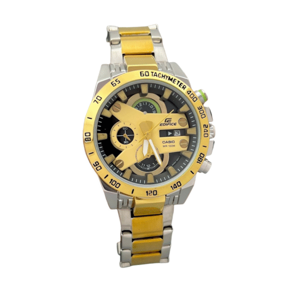 Unleash the perfect blend of precision and style with the Casio Edifice Chronograph – crafted for men who demand performance with elegance. Designed with a sleek smart dial and a bold mix of silver, black, and golden accents on the metal strap, this timepiece ensures you stand out wherever you go.