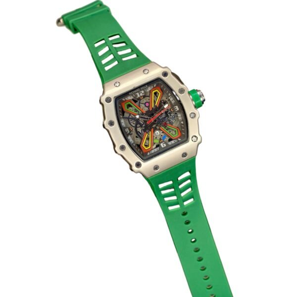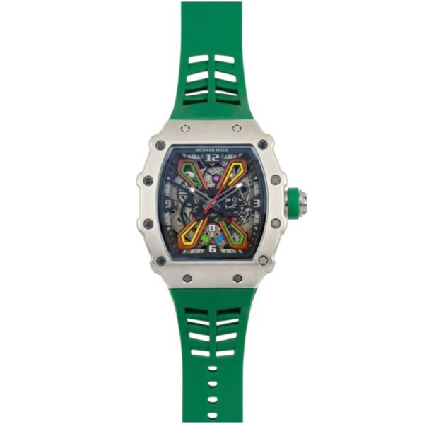 Bold and stylish men’s watch inspired by Richard Mille, featuring an intricate multi-color skeleton dial and strong heavy-quality build. Powered by precise quartz movement with working date function.