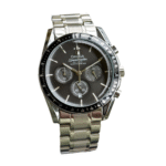 This model features a sleek black dial with three sub-dials, offering full chronograph functionality, paired with a tachymeter scale on the outer bezel for precise speed and distance measurement. Crafted with a robust stainless steel bracelet, it delivers durability without compromising style.