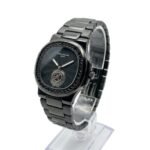 An elegant all-black luxury timepiece featuring a hypnotic spiral dial and dark stone-studded bezel for a bold, premium look. Designed with quartz movement and micro-second functionality, this watch comes with a round/tonneau-style case, integrated black metal bracelet, SS back, and butterfly lock.